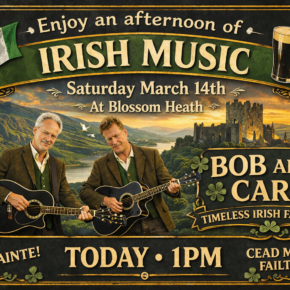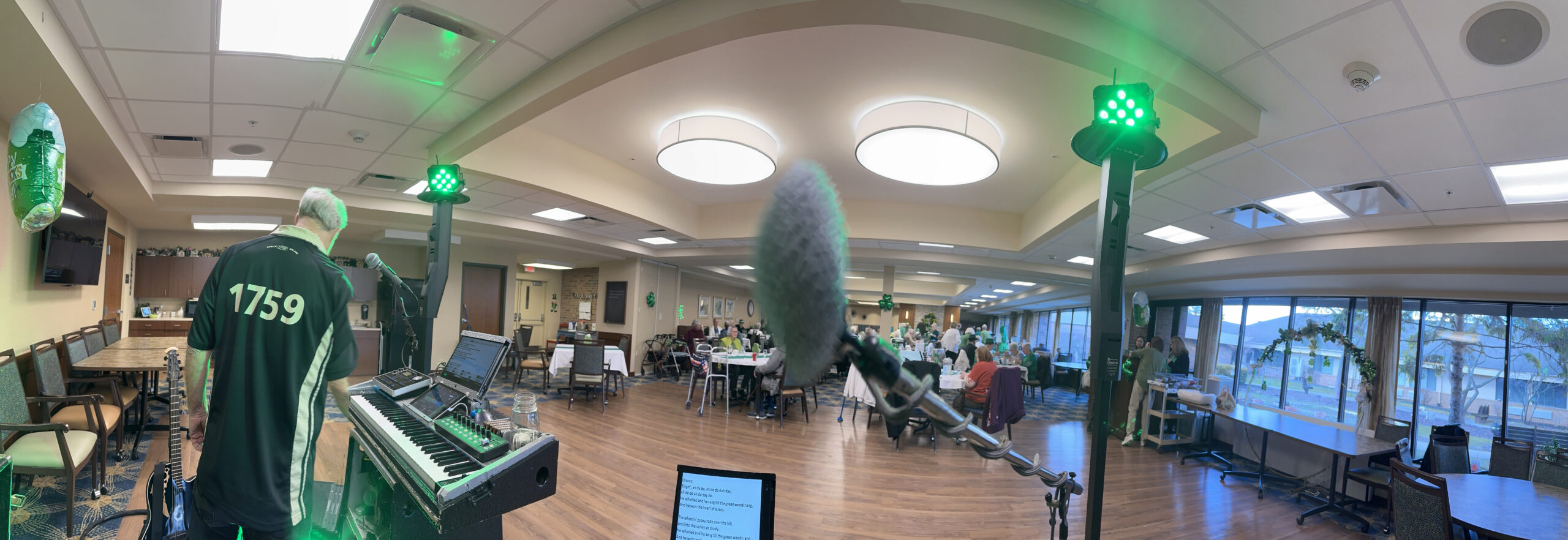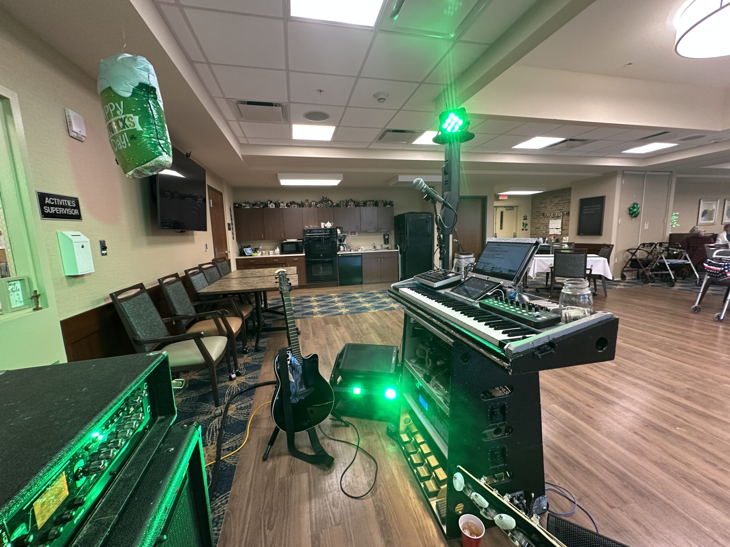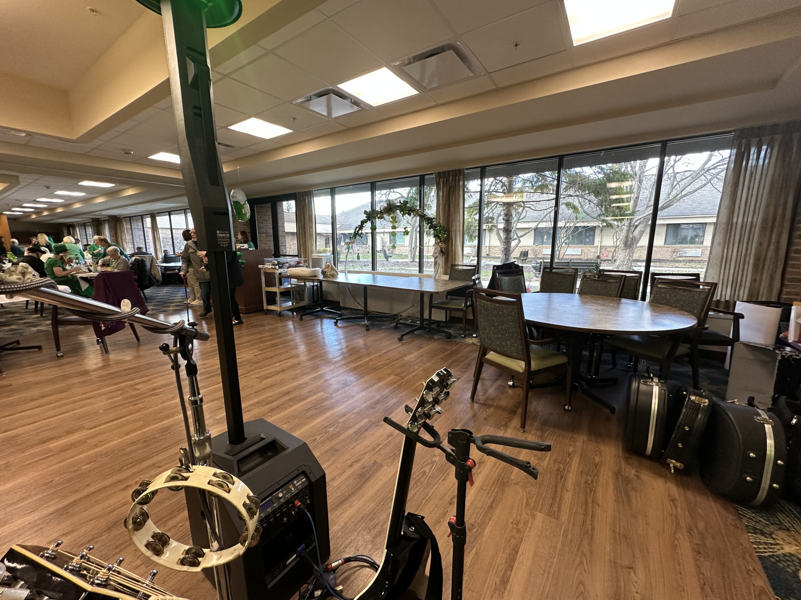 We don’t play very long, but we certainly do pack a lot of songs into a short amount of time. Â We just go with the flow, throwing in a sprinkling of Irish tunes as the night evolves. Â Before you know it, we are packing up and clearing out; leaving a trail of happy seniors in our wake.